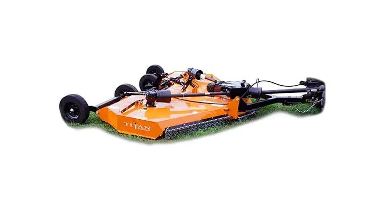 With its smooth top deck and spring suspension, this Flex-Wing Rotary Cutter is ideal for medium-duty applications such as weeds, grass, and brush up to 2” diameter. Designed for use with compact tractors of 35 hp minimum, the cutter requires only one hydraulic outlet. For its 144” cut width, the cutter uses three spindles with two free-swinging blades each, which reduce the shock of impact when a stationary object is contacted. Slip clutches protect the gearboxes and drivelines from damage. Standard equipment includes driveline shields, clutch shields, chain discharge shields and a safety tow chain.